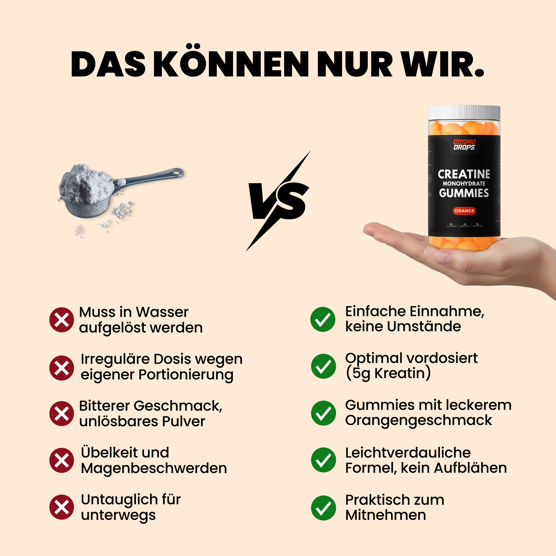 CosmoDrops werden dank ihrer innovativen Zusammensetzung schneller und besser vom Körper aufgenommen. Das führt zu weniger Magenproblemen und sorgt durch die problemlose Einnahme ohne Shaker dafür, dass Sie das Kreatin regelmäßiger nutzen, was für sichtbare Ergebnisse entscheidend ist.